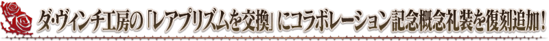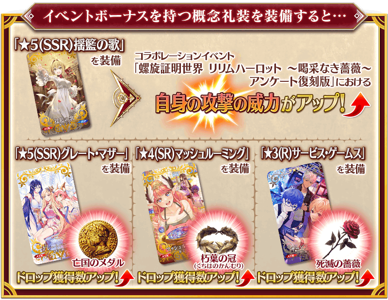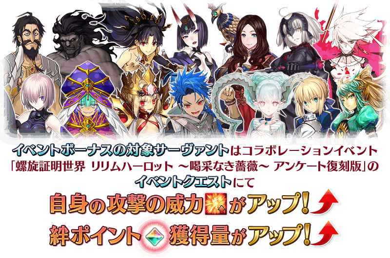 ※コラボレーションイベント「螺旋証明世界 リリムハーロット ~喝采なき薔薇~」で獲得済みの各コマンドコードを霊基変還(売却)で失っている場合でも、コラボレーションイベント「螺旋証明世界 リリムハーロット ~喝采なき薔薇~ アンケート復刻版」での報酬はレアプリズムやマナプリズムに変化します。