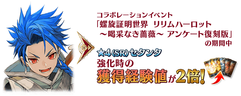 復刻前の期間限定Fate/Grand Order Arcade×Fate/Grand Orderコラボレーションイベント「螺旋証明世界 リリムハーロット ~喝采なき薔薇~」で「★4(SR)セタンタ」を入手していた場合は、本イベントで再入手特典を獲得可能です。