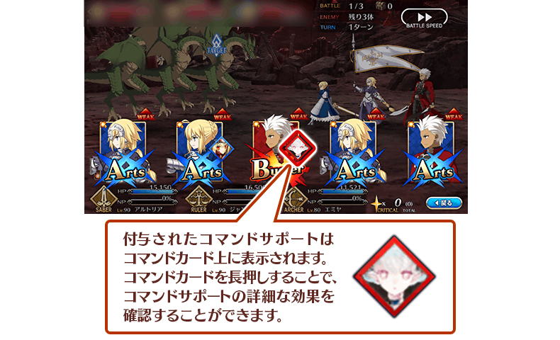 ※Extraカードと宝具カードにコマンドサポートは付与されません。 ※一部スキルおよび宝具によりコマンドカードのカードタイプを変化させても、付与されたコマンドサポートは元のコマンドカードに付与されたままとなります。