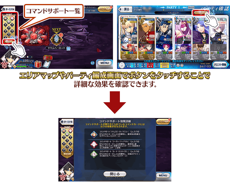 また、コマンドサポート一覧の「効果詳細」や、パーティ確認画面の「コマンドサポート詳細」のボタンをタッチすることで、各サポートの詳細な効果を確認することも可能です。