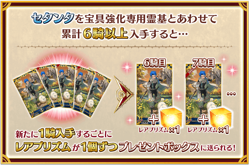 「★4(SR)セタンタ」を宝具強化専用霊基とあわせて「累計で6騎以上」入手すると、6騎目以降、新たに1騎入手するごとにレアプリズム1個がプレゼントボックスに送られます。
