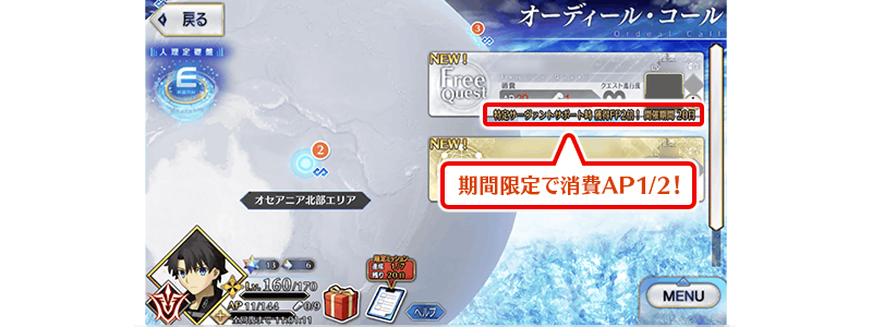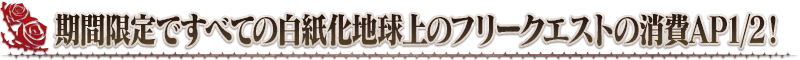 下記の期間中、白紙化地球上におけるフリークエストの消費APが1/2になります!(バトルにおいて撤退した場合でも、同様の消費量になります)