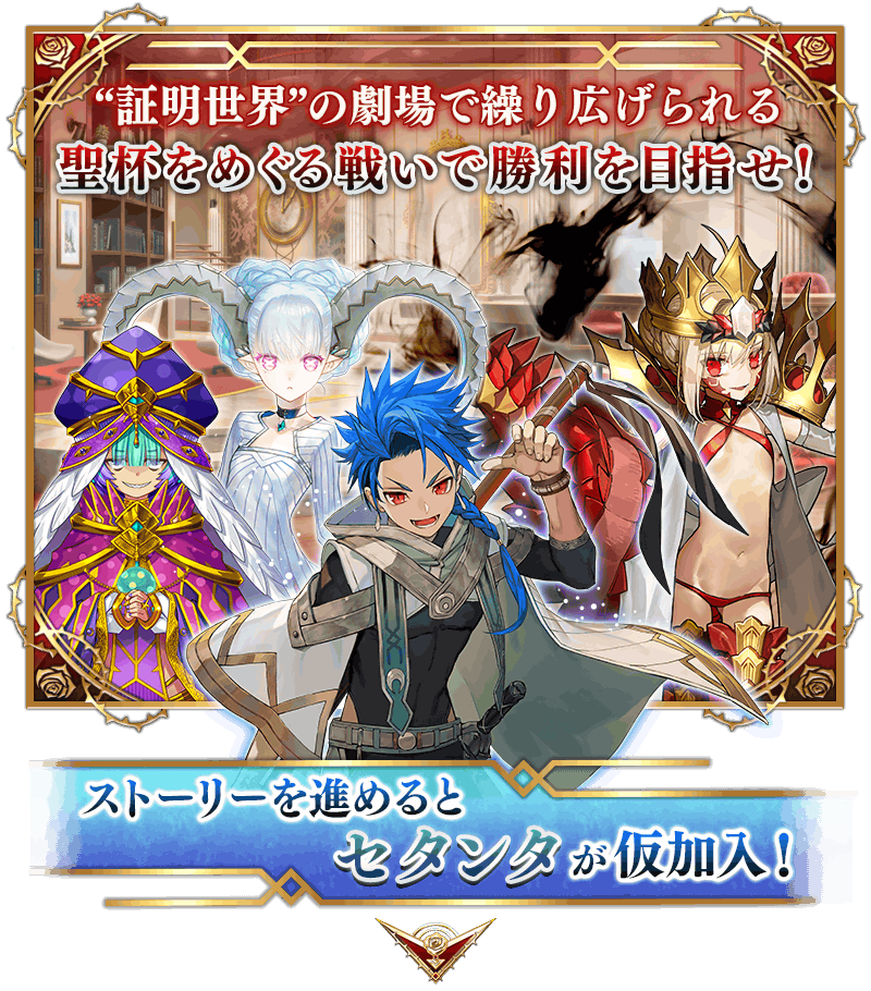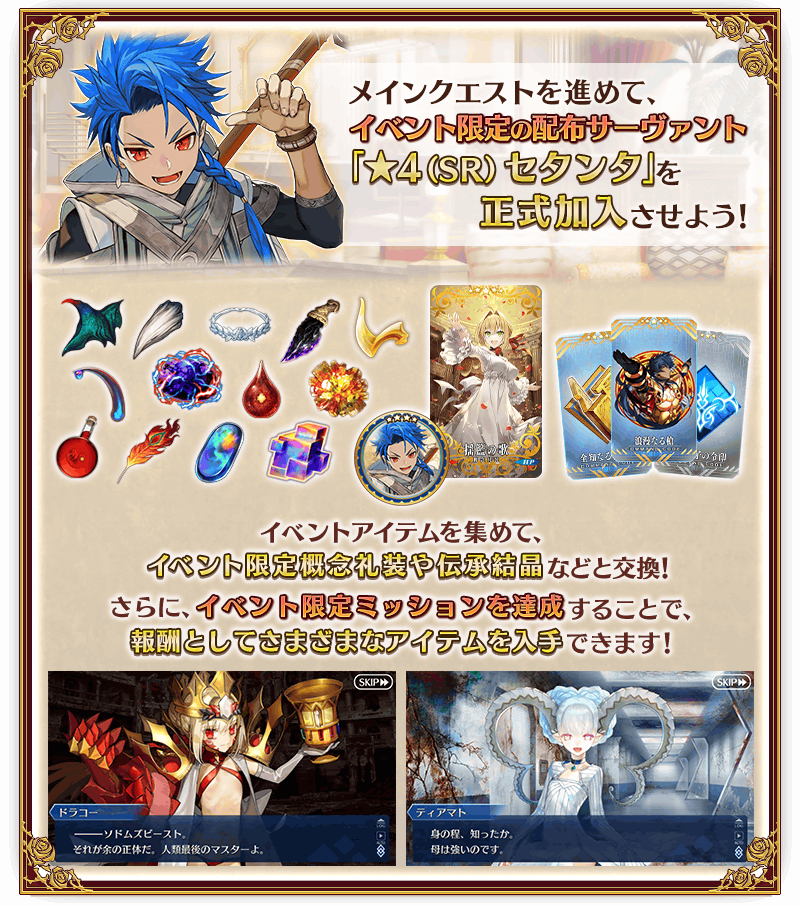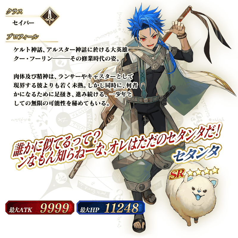 ※本ページの画像はすべて開発中のものです。実際の画像とは異なる場合があります。 ※2019年1月1日(火) 0:00以降に新たに配信されるメインストーリー、期間限定イベント、一部クエスト、キャンペーンおよび召喚では、真名隠し対象サーヴァントの真名が表示されます。 ※一部のクエストは後日開放されます。 ※「★4(SR)セタンタ」は、イベント開幕直後に開放されているメインクエストをクリアした段階では仮加入しませんのでご注意ください。