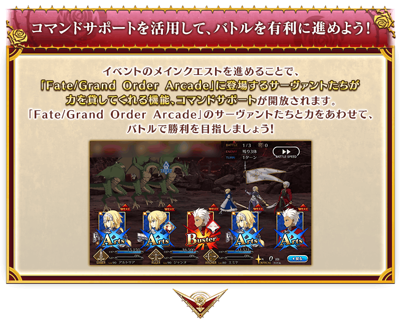 本イベントでは、「Fate/Grand Order Arcade」に登場するサーヴァントたちがバトル中に力を貸してくれる機能、コマンドサポートが追加されます。