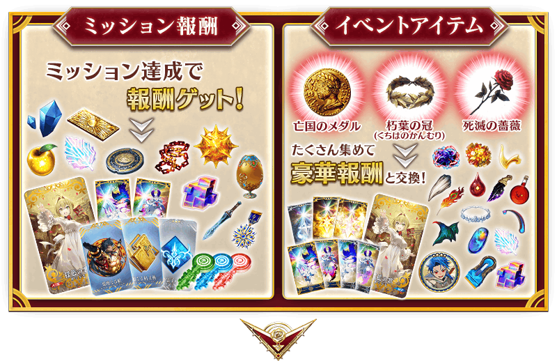※伝承結晶、英霊結晶・流星のフォウくんALL★4(HP)、英霊結晶・日輪のフォウくんALL★4(ATK)については、後日開放される本イベントのメインクエストをクリアすることで交換可能になります。 ※「★4(SR)セタンタ」のサーヴァントコインは、「★4(SR)セタンタ」の正式加入後に交換可能となります。 ※「★4(SR)セタンタ」を前回開催時に正式加入させている場合、同サーヴァントのサーヴァントコインはイベント開幕時から交換することができます。 ※イベントアイテム交換期間終了後「亡国のメダル」「朽葉の冠」「死滅の薔薇」は消滅します。