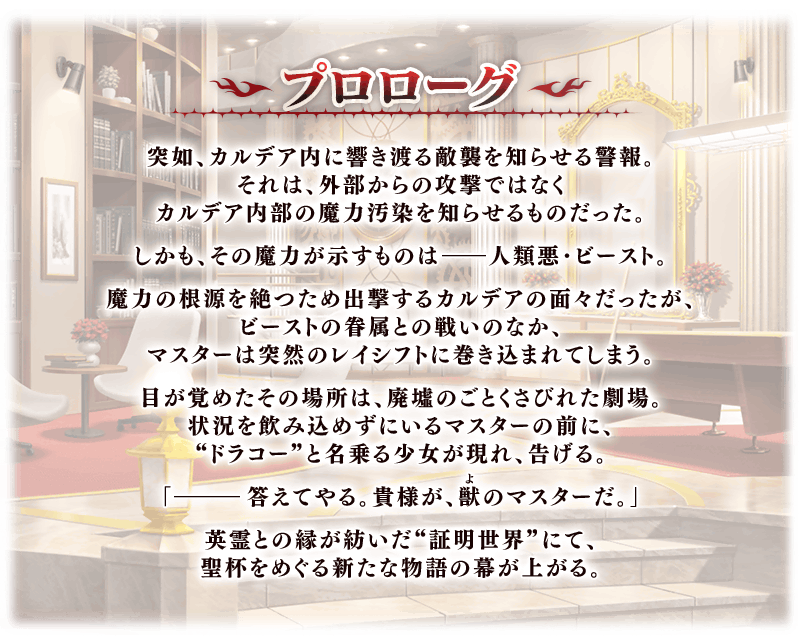 突如カルデアを襲う人類悪・ビーストと対峙するマスターたち。