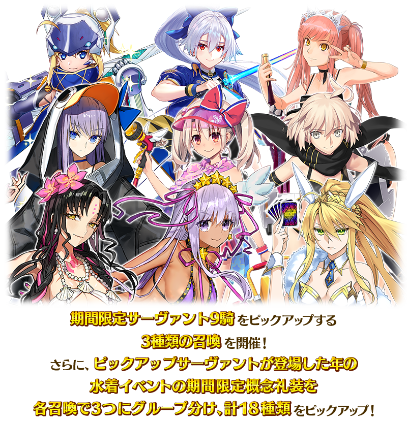 期間限定イベント「BBプレゼンツ☆セレブサマー・エクスペリエンス! ~逆襲のドバイ~」の開幕を記念して、期間限定サーヴァント9騎をピックアップする3種類の召喚を開催いたします!
