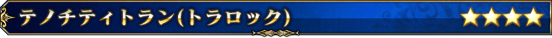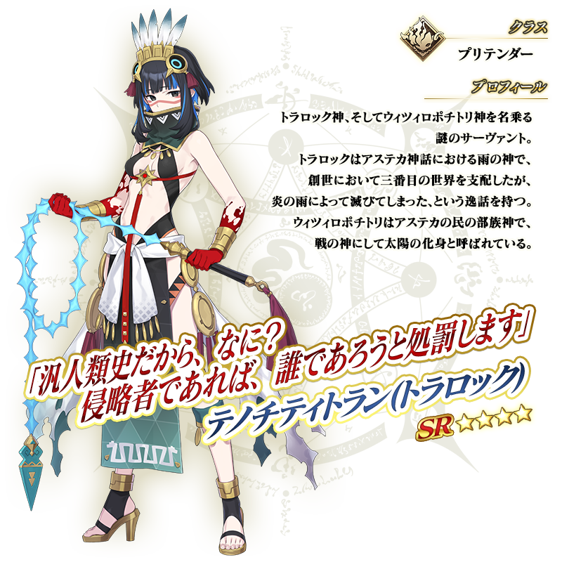 ※「★4(SR)テノチティトラン(トラロック)」は、第2部 第7章「Lostbelt No.7 黄金樹海紀行 ナウイ・ミクトラン 惑星を統べるもの」の特定のメインクエストをクリアしたうえで「トラロック」を霊基再臨第3段階にすることで、名称が「テノチティトラン」に変化します。