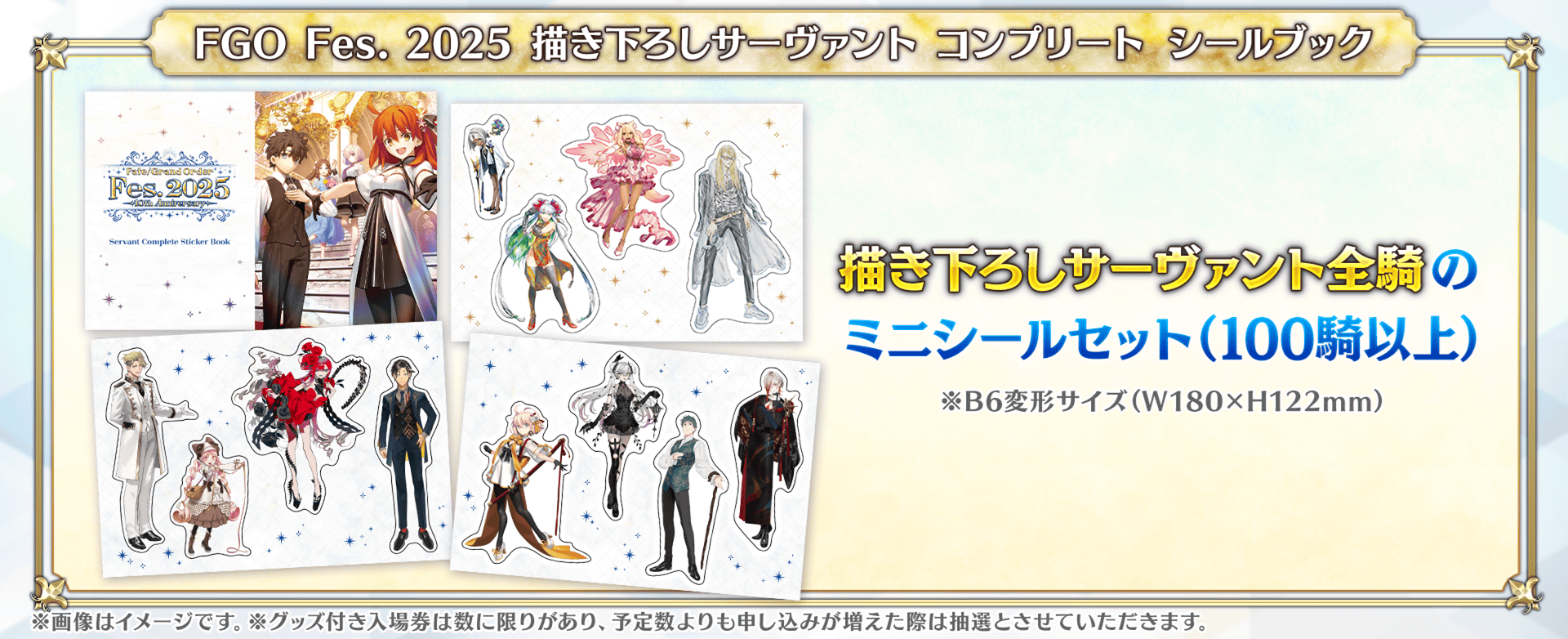 グッズ付きチケットをご購入いただいた方には、「FGO Fes. 2025 描き下ろしサーヴァント コンプリート シールブック」を会場でお渡しいたします。