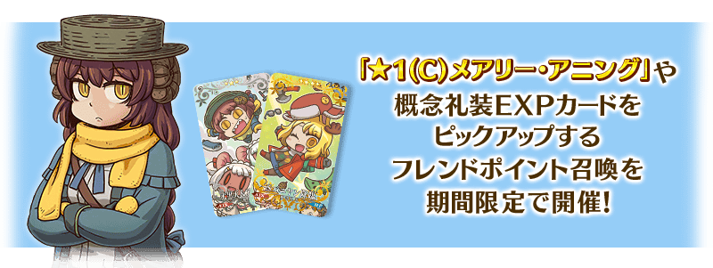 本フレンドポイント召喚からは、通常のフレンドポイント召喚から排出されるものに加え「★1(C)メアリー・アニング」のほか、概念礼装を大幅に強化できるEXPカード「★4(SR)Sバニヤン降臨」「★3(R)大黒天&アニング降臨」が排出されるようになります。