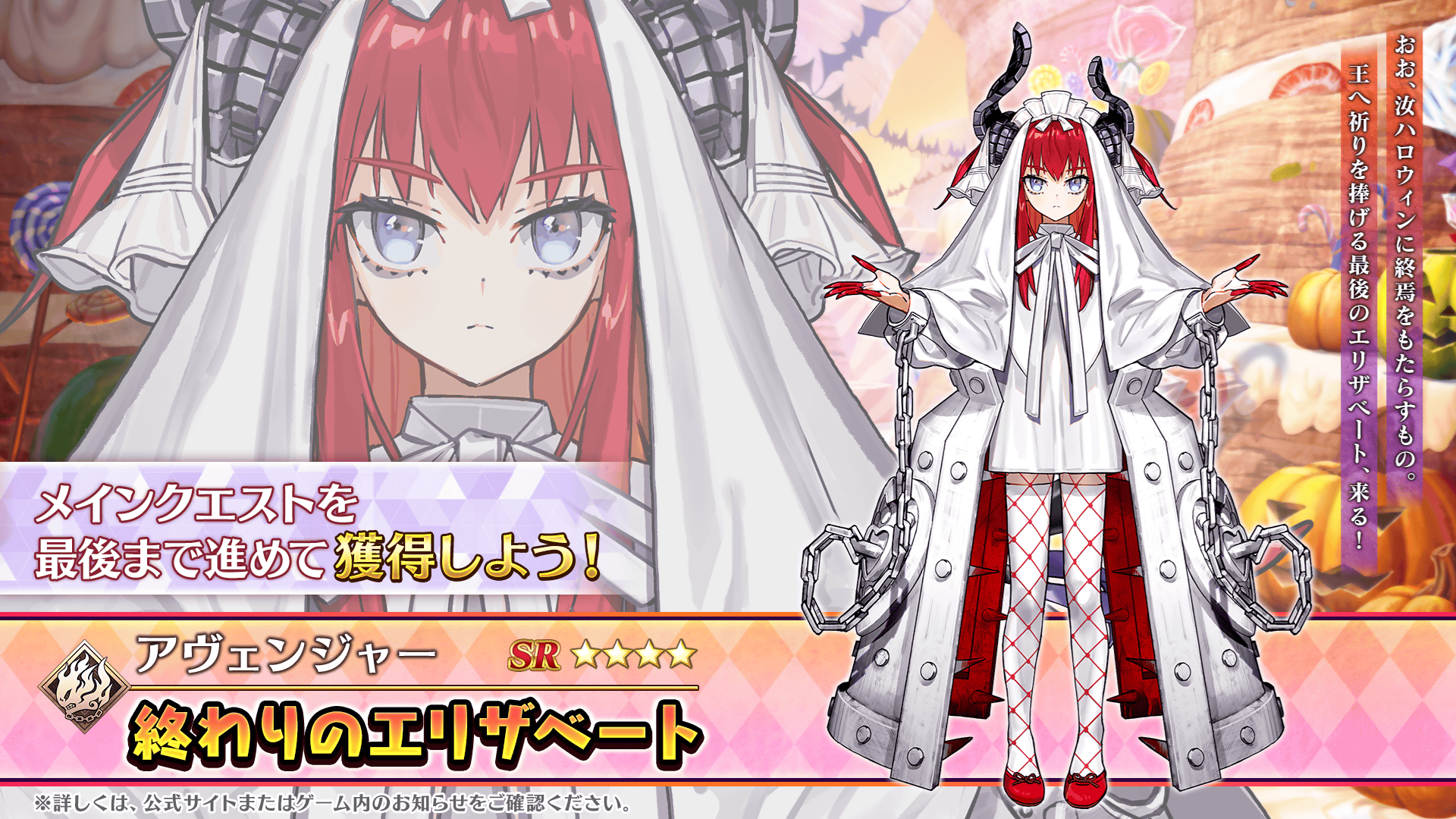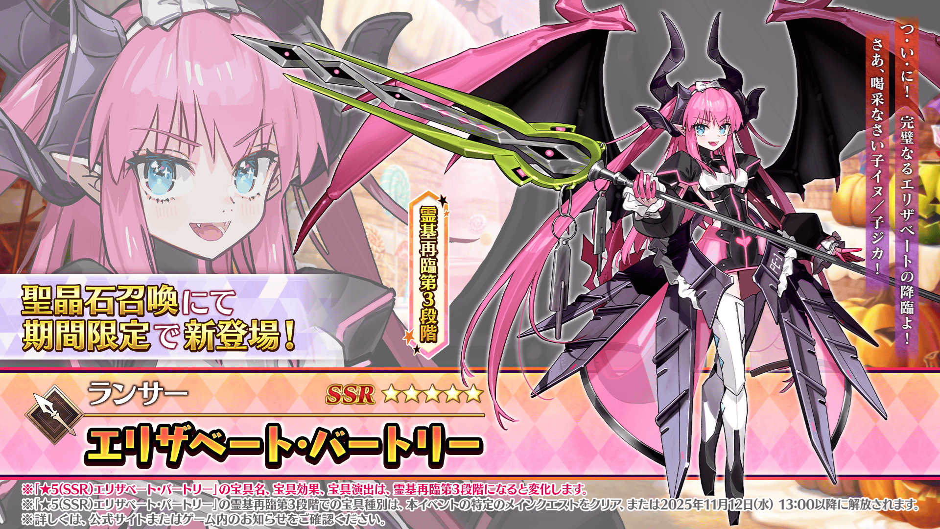 期間限定で「ファイナル・ハロウィン2025 ★5(SSR)エリザベート・バートリーピックアップ召喚」を開催することを発表いたしました。