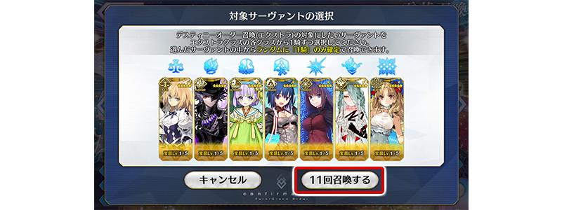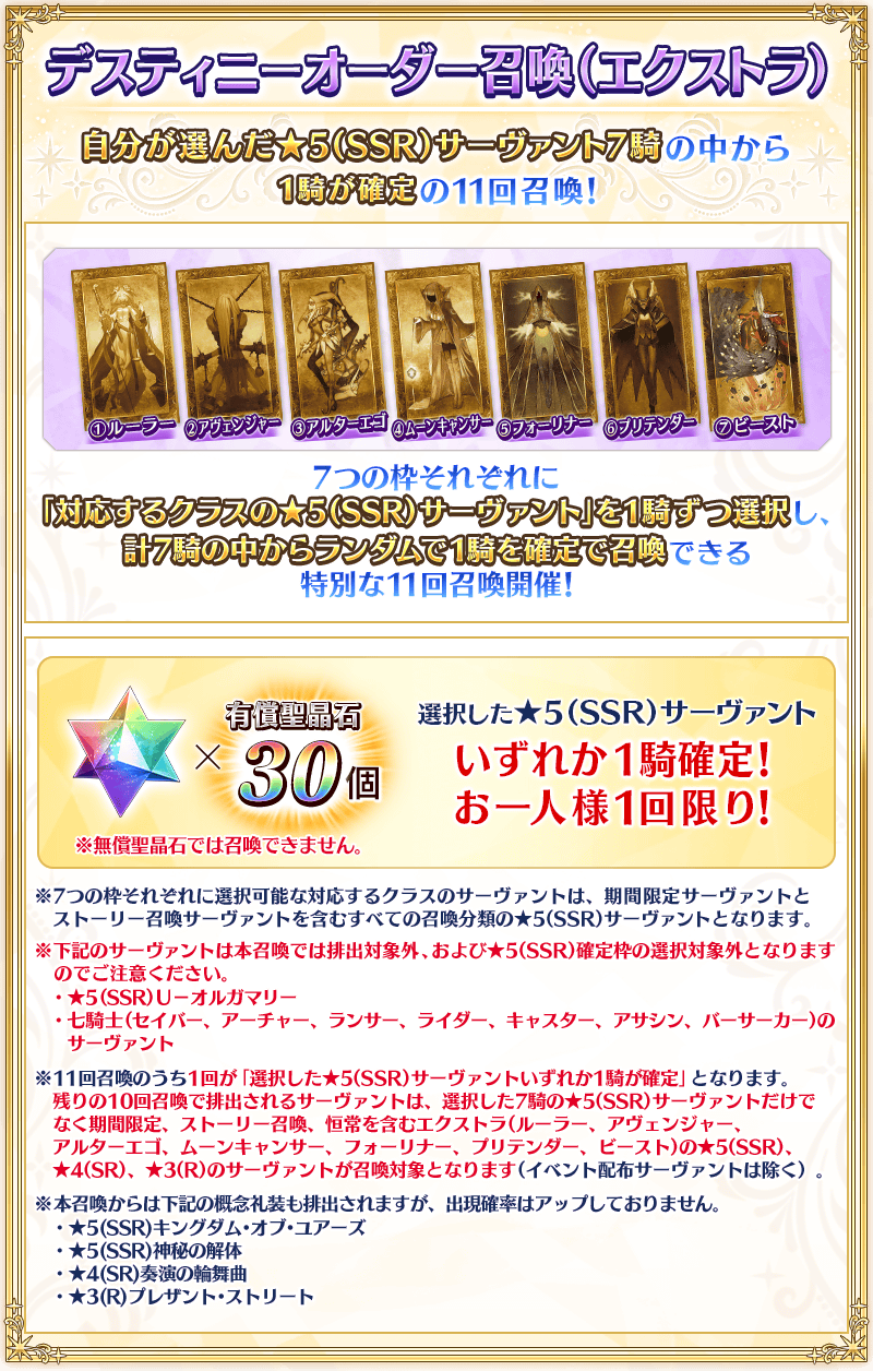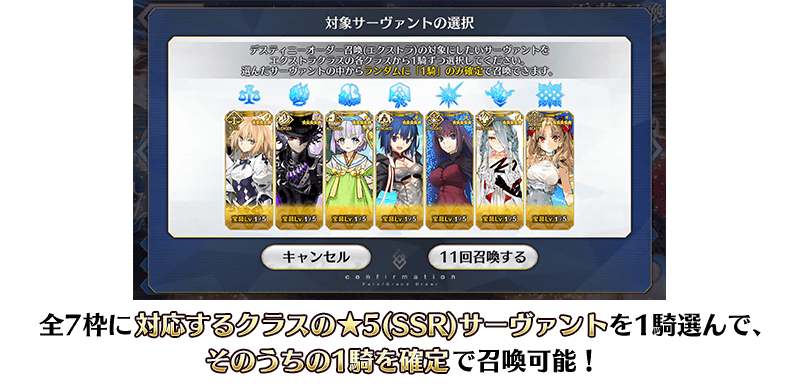 「デスティニーオーダー召喚(エクストラ)」では、7騎の★5(SSR)サーヴァントを選択できます。