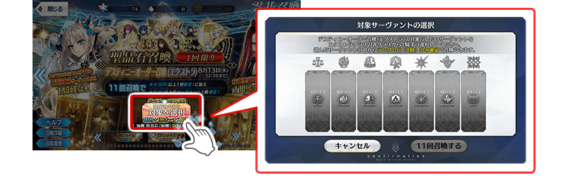 ※「★5(SSR)U-オルガマリー」は選択対象外、および召喚対象外となります。 ※選択できるサーヴァントは各クラスから1騎のみになります。ルーラークラスから3騎、アヴェンジャークラスから3騎、アルターエゴクラスから1騎というような選択はできません。 ※必ず7騎選択した状態でなければ召喚はおこなえません。(ルーラークラスに「★5(SSR)ジャンヌ・ダルク(ルーラー)」だけなど、選択が7騎に満たない状態では召喚をおこなえません。) ※選択可能なサーヴァントは★5(SSR)サーヴァントのみとなります。 ※11回召喚のうち1回が「選択した★5(SSR)サーヴァントいずれか1騎が確定」となります。残りの10回召喚で排出されるサーヴァントは、選択した7騎の★5(SSR)サーヴァントだけでなく期間限定、ストーリー召喚、恒常を含むエクストラ(ルーラー、アヴェンジャー、アルターエゴ、ムーンキャンサー、フォーリナー、プリテンダー、ビースト)の★5(SSR)、★4(SR)、★3(R)のサーヴァントが召喚対象となります (イベント配布サーヴァントは除く)。