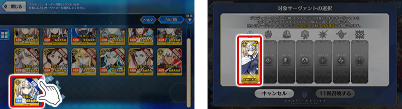 なお、「対象サーヴァントの選択」ダイアログにて「キャンセル」をタッチした場合、選択していた状況を保存してデスティニーオーダー召喚(エクストラ)用のダイアログを閉じることができます。