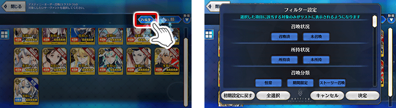 サーヴァント選択画面では、画面右上の「フィルター」を使用することでサーヴァントの所持状況や宝具タイプなどによって表示するサーヴァントを絞り込むことができます。
