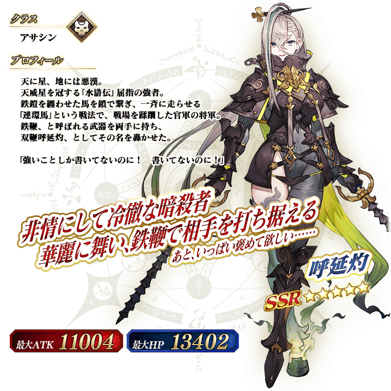 ※上記の「★5(SSR)呼延灼(アサシン)」のイラストは霊基再臨第2段階のものです。