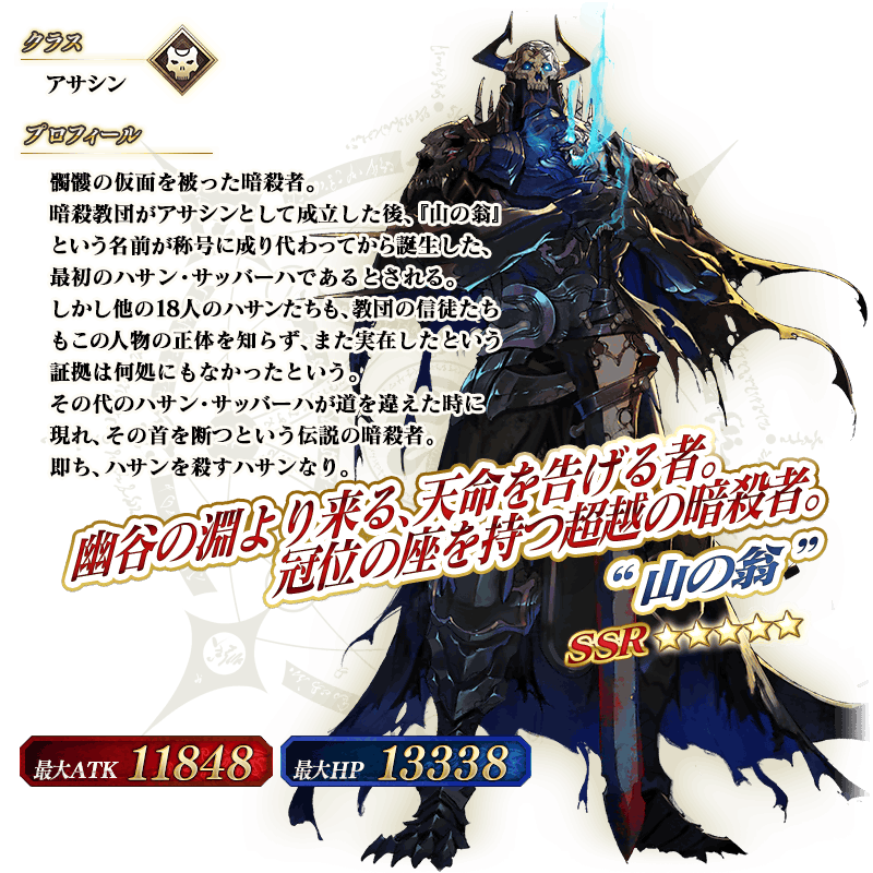 ※上記の「★5(SSR)“山の翁”」のイラストは霊基再臨第2段階のものです。