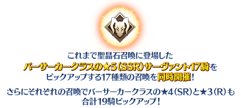 ※★4(SR)以上確定にはサーヴァントと概念礼装が含まれます。 ※バーサーカークラス以外のサーヴァントも排出されますのでご注意ください。 ※2019年1月1日(火) 0:00以降に新たに配信されるメインストーリー、期間限定イベント、一部クエスト、キャンペーンおよび召喚では、真名隠し対象サーヴァントの真名が表示されます。
