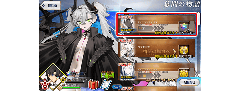 「幕間の物語」の開放条件も、通常時は対象サーヴァントの「絆Lv.」「霊基再臨段階」も条件となるところを、「特定のメインクエストのクリア」または「幕間の物語の前節のクリア」のみに緩和されます。