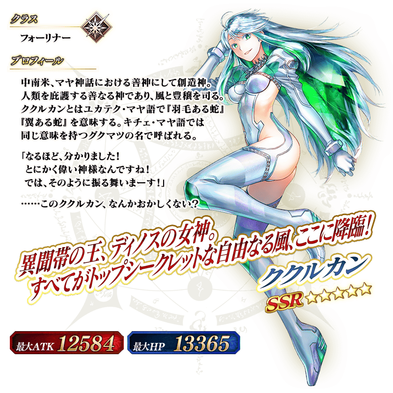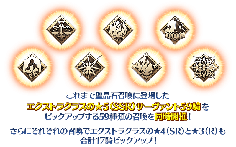 ※★4(SR)以上確定にはサーヴァントと概念礼装が含まれます。 ※エクストラクラス以外のサーヴァントも排出されますのでご注意ください。 ※2019年1月1日(火) 0:00以降に新たに配信されるメインストーリー、期間限定イベント、一部クエスト、キャンペーンおよび召喚では、真名隠し対象サーヴァントの真名が表示されます。