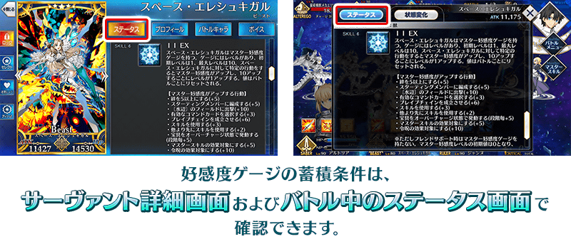※「★5(SSR)スペース・エレシュキガル」は下記の場合、マスター好感度ゲージは0で固定となり各種条件を達成してもマスター好感度ゲージは変動しません。 ・ほかのマスターからのサポートサーヴァントとして「★5(SSR)スペース・エレシュキガル」を編成した場合 ・マスターが不在になるなど、通常とは異なる一部のバトルに出撃する場合 ※マスター好感度ゲージの好感度レベルや好感度段階は、バトル毎にリセットされます。 ※バトルに敗北しコンティニューした場合、「★5(SSR)スペース・エレシュキガル」の好感度ゲージは戦闘不能時の状況が引き継がれます。