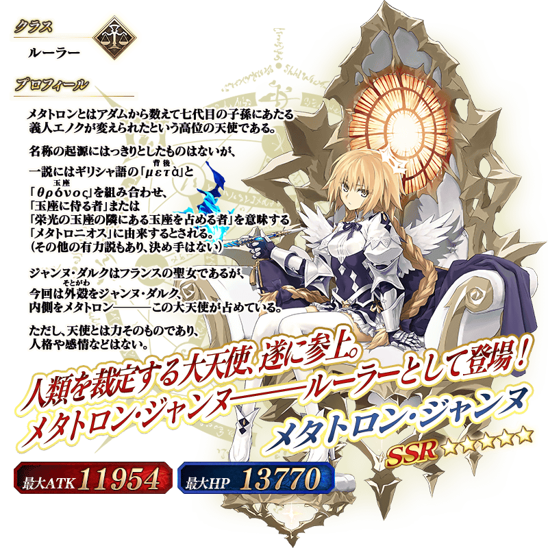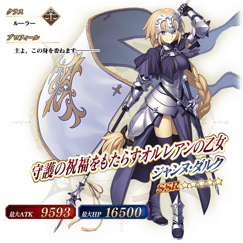 ※上記の「★5(SSR)ジャンヌ・ダルク(ルーラー)」のイラストは霊基再臨第2段階のものです。