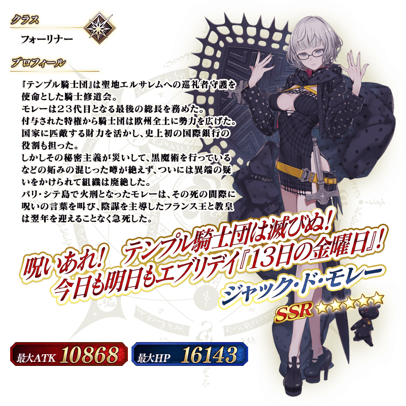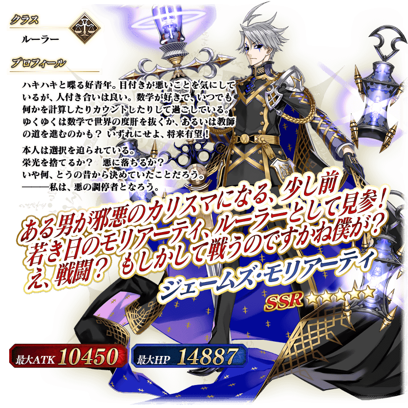 ※上記の「★5(SSR)ジェームズ・モリアーティ(ルーラー)」のイラストは霊基再臨第2段階のものです。