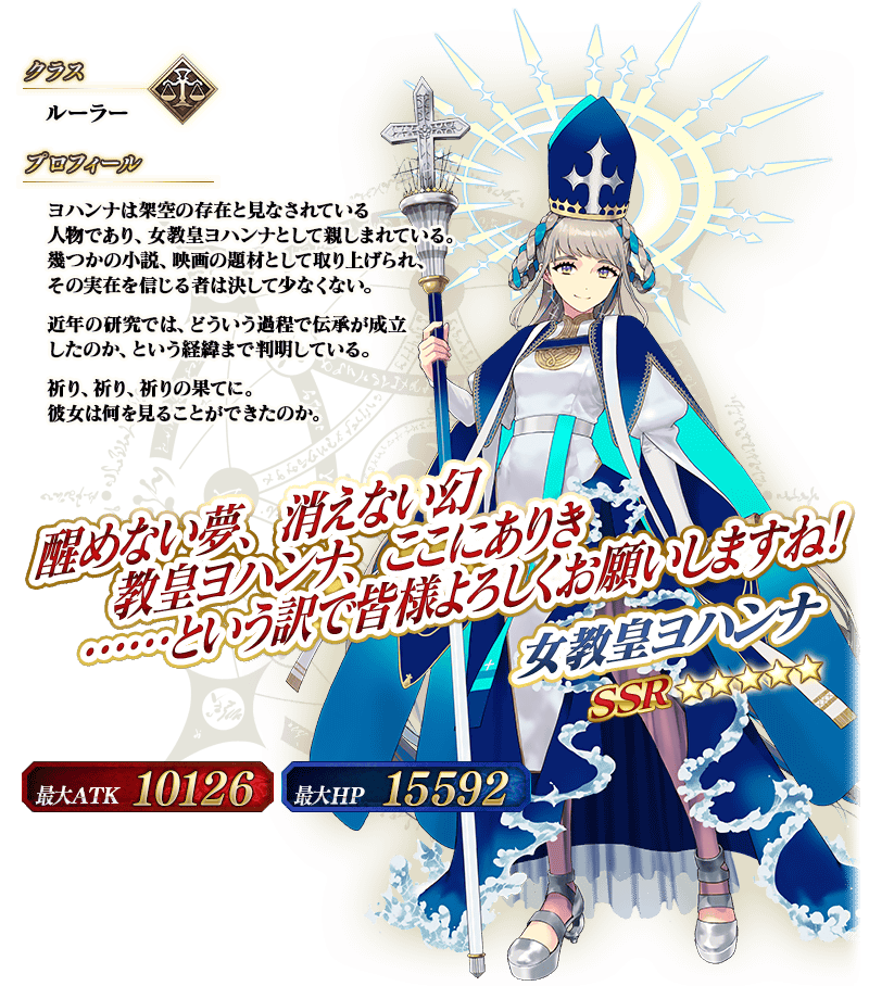 ※上記の「★5(SSR)女教皇ヨハンナ」のイラストは霊基再臨第3段階のものです。