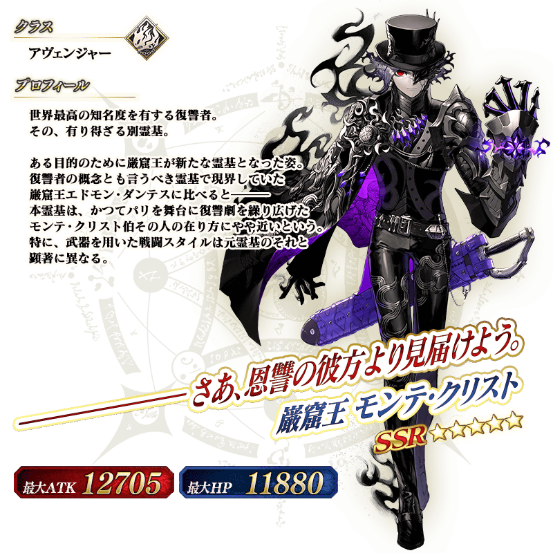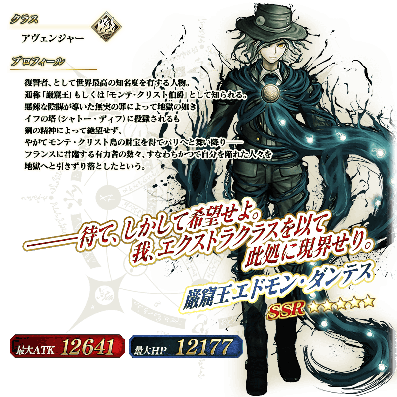 ※上記の「★5(SSR)巌窟王 エドモン・ダンテス」のイラストは霊基再臨第2段階のものです。