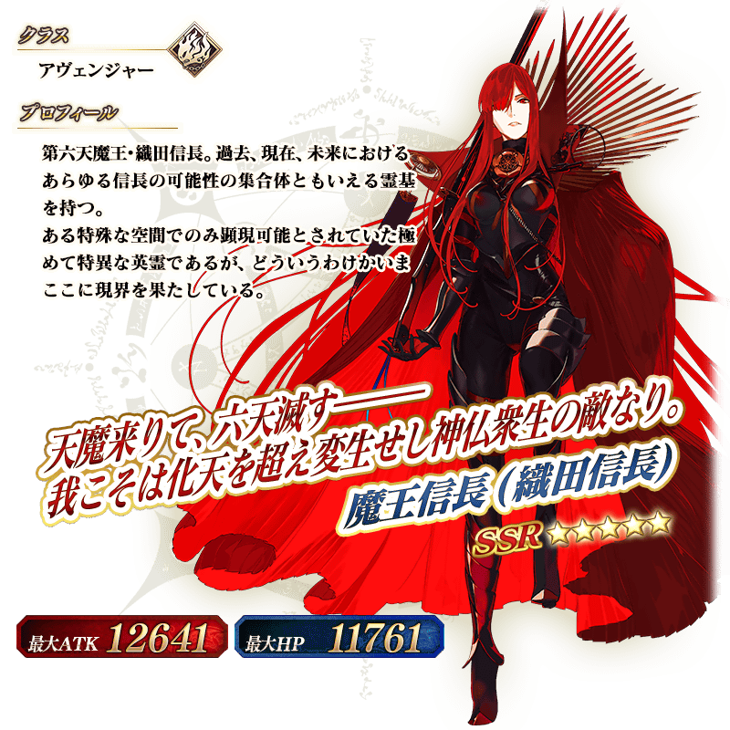 ※上記の「★5(SSR)魔王信長(織田信長)」のイラストは霊基再臨第3段階のものです。 ※「★5(SSR)魔王信長(織田信長)」は「★5(SSR)織田信長」を霊基再臨第3段階にすることで名称が「★5(SSR)魔王信長」に変化します。