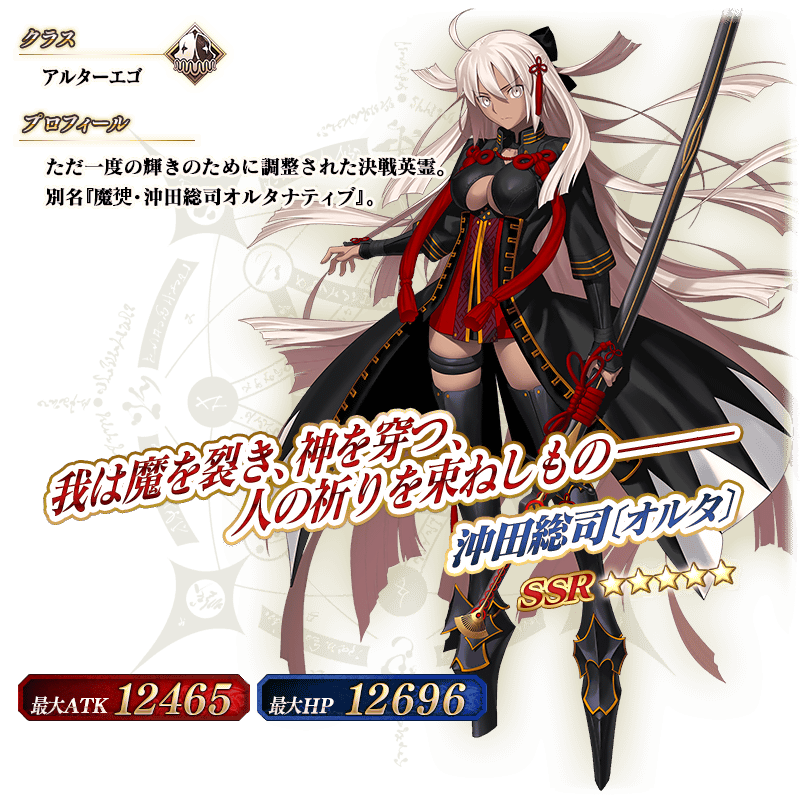 ※上記の「★5(SSR)沖田総司〔オルタ〕(アルターエゴ)」のイラストは霊基再臨第2段階のものです。