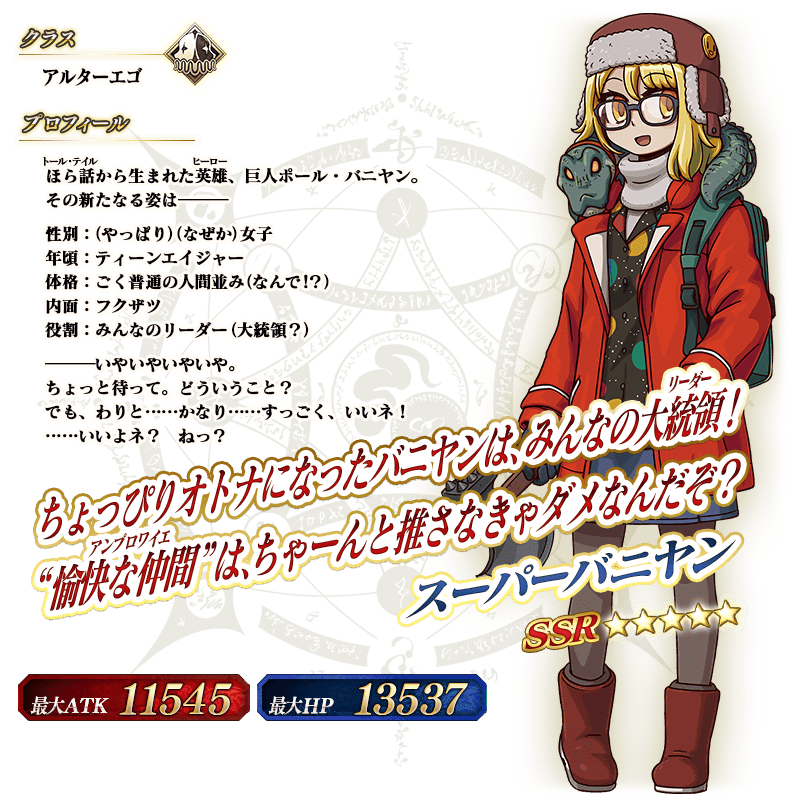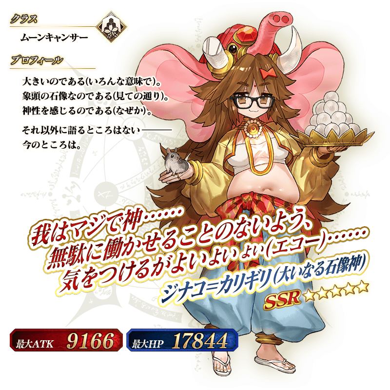 ※上記の「★5(SSR)ジナコ=カリギリ(大いなる石像神)」のイラストは霊基再臨第2段階のものです。 ※「★5(SSR)大いなる石像神」を霊基再臨第2段階にすることで名称が「★5(SSR)ジナコ=カリギリ」に変化します。