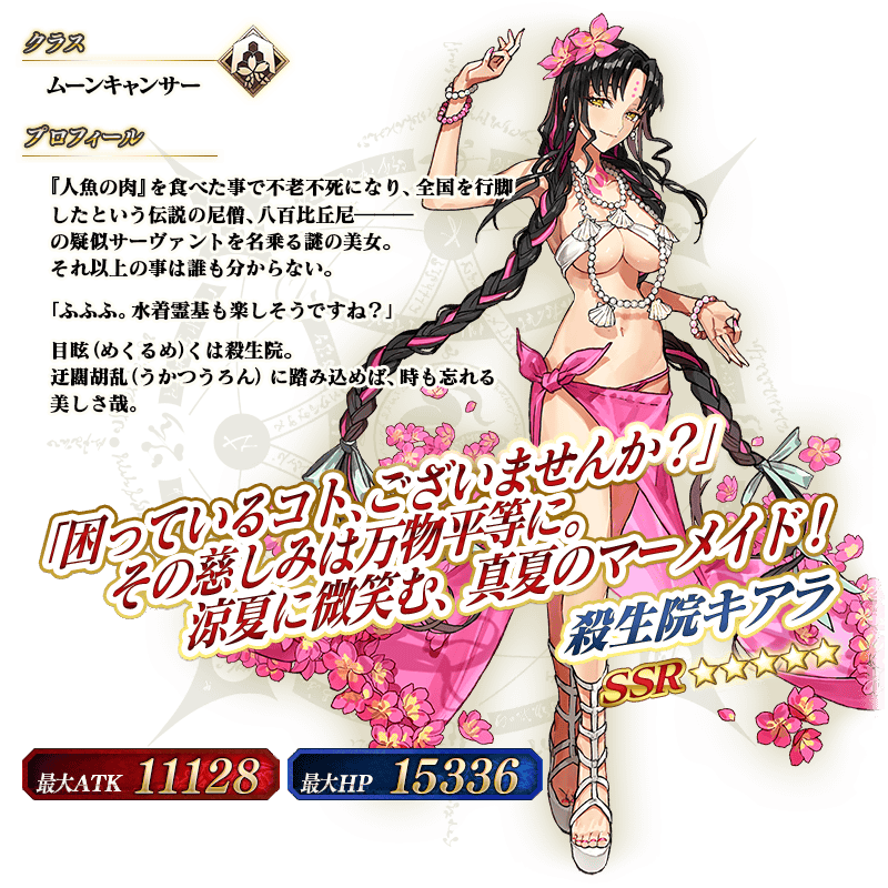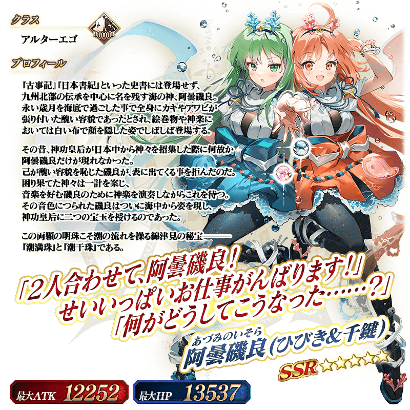 ※上記の「★5(SSR)阿曇磯良(ひびき&千鍵)」のイラストは霊基再臨第2段階のものです。 ※「★5(SSR)阿曇磯良(ひびき&千鍵)」は、「★5(SSR)ひびき&千鍵」を霊基再臨第2段階にすることで名称が「★5(SSR)阿曇磯良」に変化します。