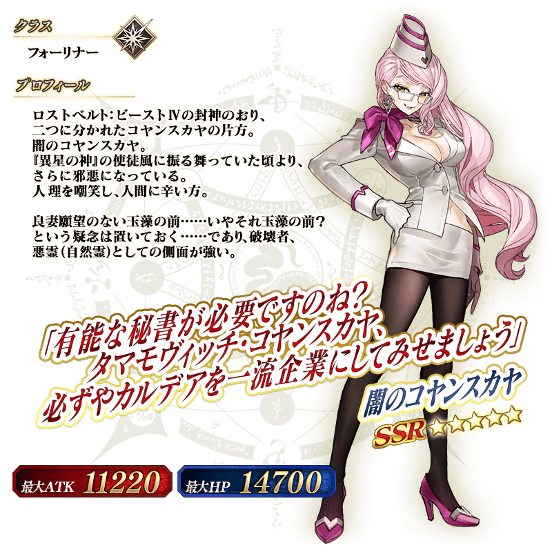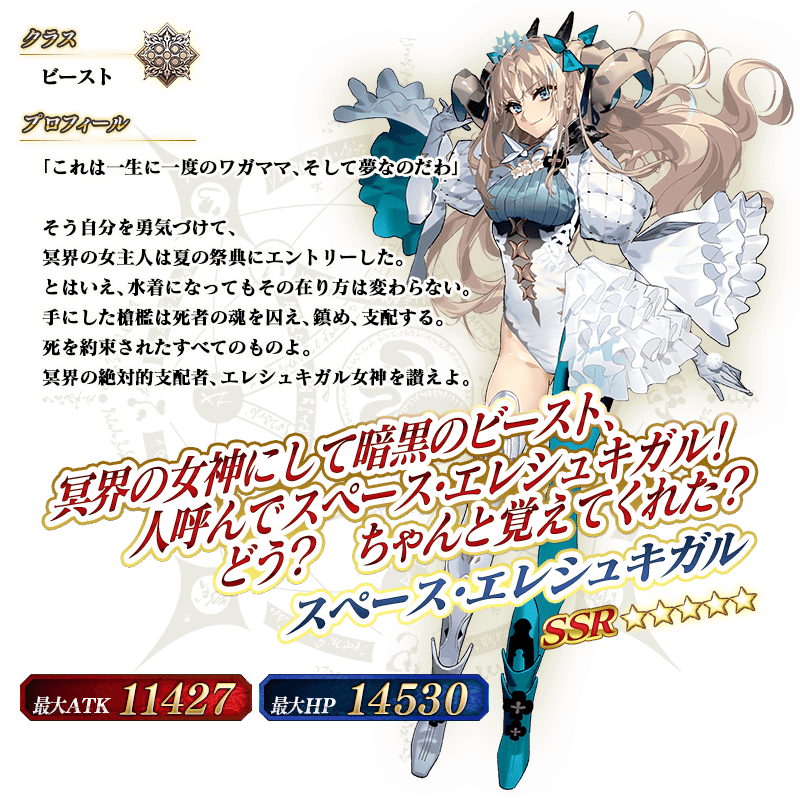 ※上記の「★5(SSR)スペース・エレシュキガル」のイラストは霊基再臨第3段階のものです。 ※「★5(SSR)スペース・エレシュキガル」は、「★5(SSR)エレシュキガル(ビースト)」を霊基再臨第3段階にすることで名称が「★5(SSR)スペース・エレシュキガル」に変化します。