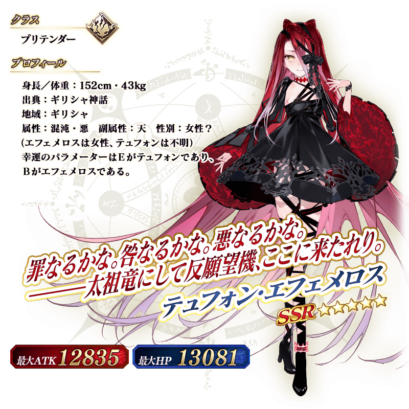 ※上記の「★5(SSR)テュフォン・エフェメロス」のイラストは霊基再臨第2段階のものです。