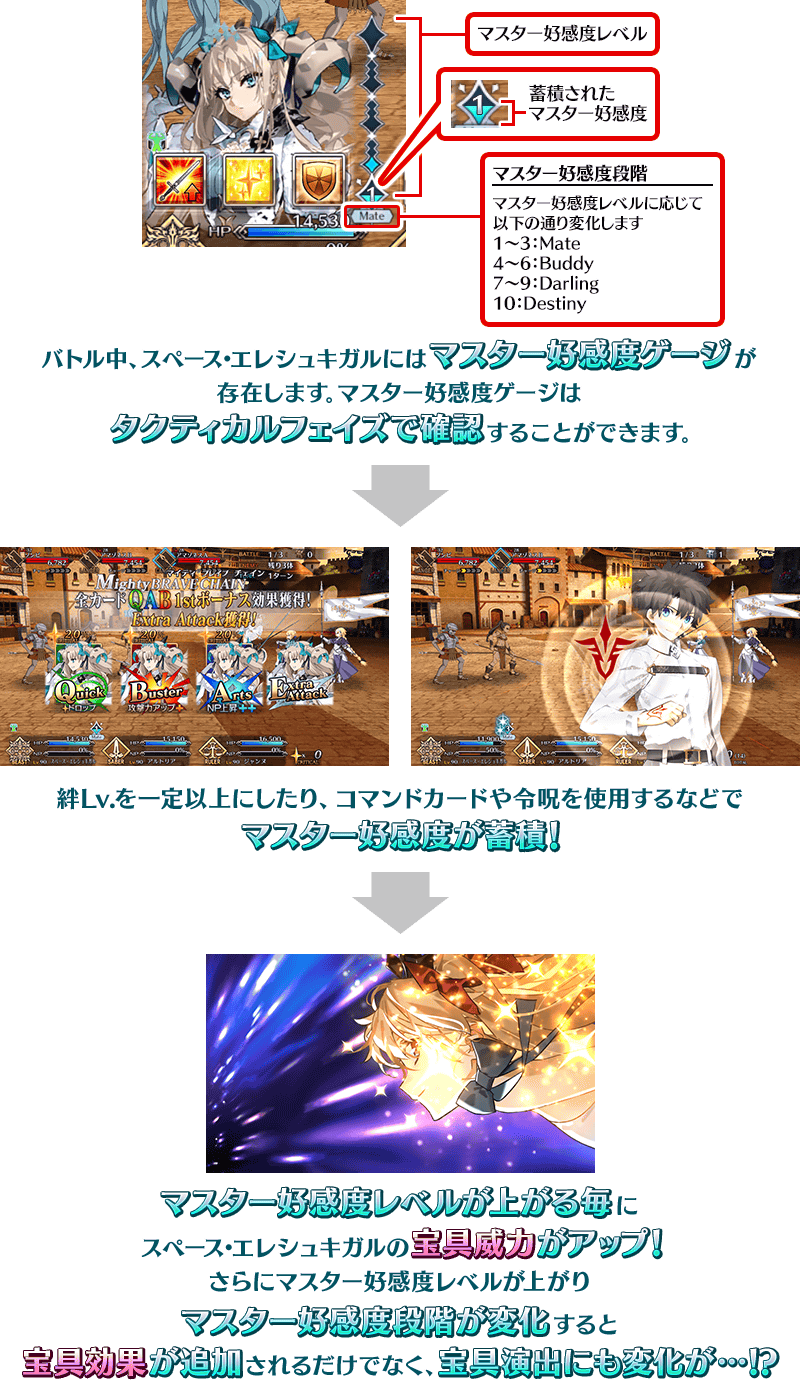 バトルの開始時やバトル中にさまざまな条件でマスター好感度が蓄積していき、マスター好感度レベルが上がります。レベルが上がる毎に宝具威力がアップしていき、特定のレベルになるとさまざまな宝具効果も追加されます!