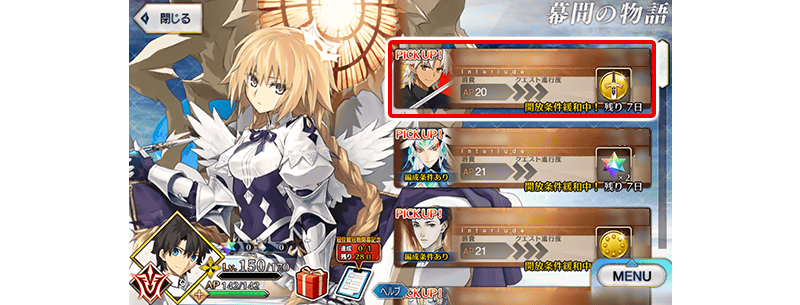 「幕間の物語」の開放条件も、通常時は対象サーヴァントの「絆Lv.」「霊基再臨段階」も条件となるところを、「特定のメインクエストのクリア」または「幕間の物語の前節のクリア」のみに緩和されます。