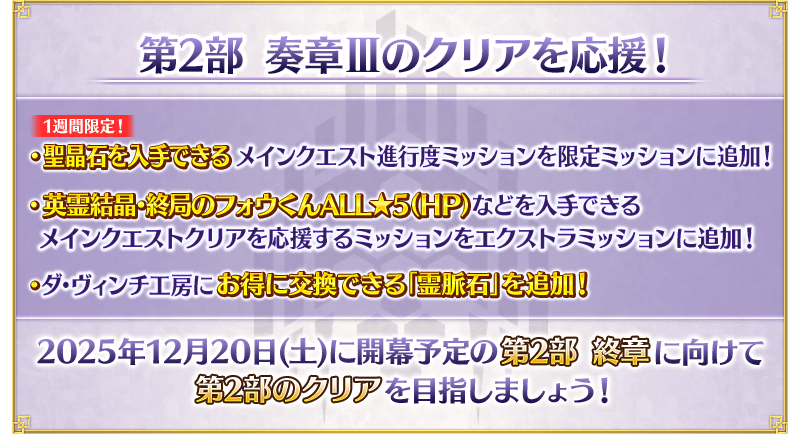 2025年12月20日(土) 12:59までに「奏章Ⅳ 人類裁決法廷 トリニティ・メタトロニオス」をクリアし、「第2部 終章」の参加条件を満たすことで聖晶石1,000個を獲得できます。