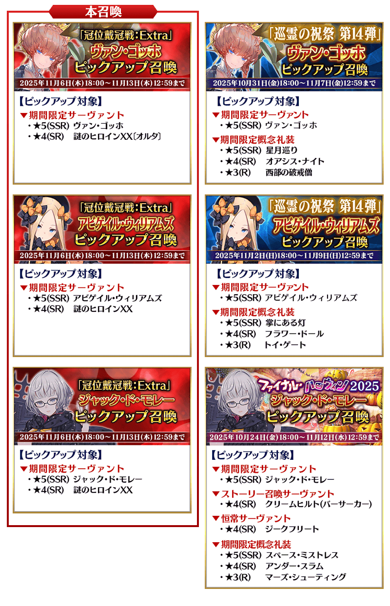 「★5(SSR)ヴァン・ゴッホ」「★5(SSR)アビゲイル・ウィリアムズ」「★5(SSR)ジャック・ド・モレー」は『「冠位戴冠戦:Lancer」&「冠位戴冠戦:Extra」ピックアップ召喚』でピックアップされるほかに、10月31日(金) 18:00より開催されている『「巡霊の祝祭 第14弾」ピックアップ召喚』、10月24日(金) 18:00より開催されている「ファイナル・ハロウィン2025ピックアップ2召喚」でもピックアップされます。