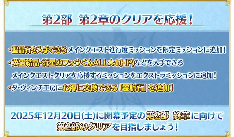 2025年12月20日(土) 12:59までに「第2部 終章」の参加条件である「奏章Ⅳ 人類裁決法廷 トリニティ・メタトロニオス」をクリアすることで聖晶石1,000個を獲得できます。
