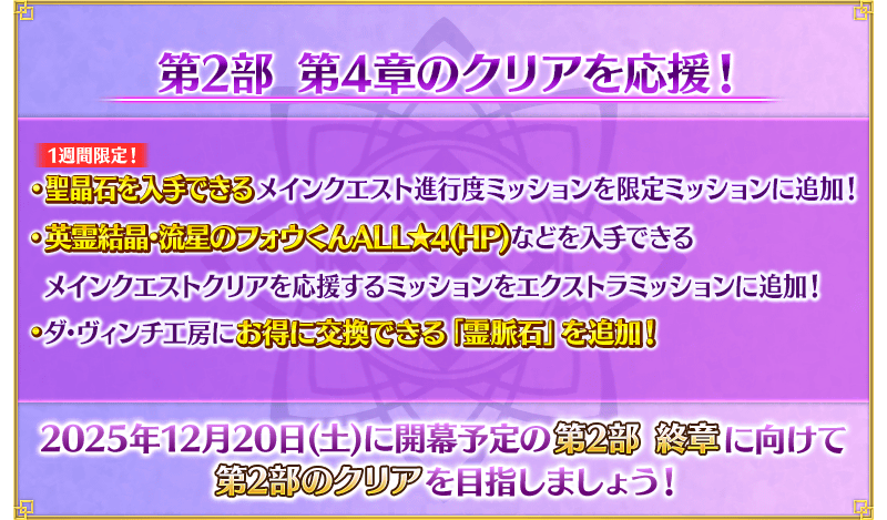さらに、「Lostbelt No.4」における難所のクエストクリア応援ミッションも登場!