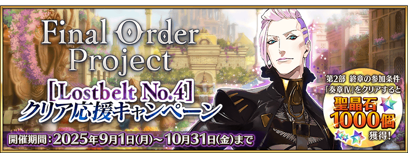 「Final Order Project [Lostbelt No.4]クリア応援キャンペーン」では、「第2部 終章」に向けて、さまざまな施策で第2部のクリアを応援いたします!