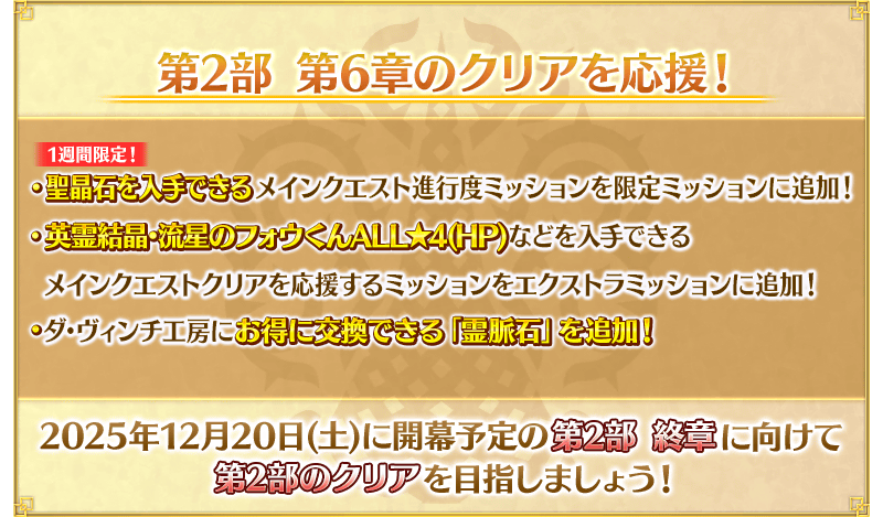 2025年12月20日(土) 12:59までに「第2部 終章」の参加条件である「奏章Ⅳ 人類裁決法廷 トリニティ・メタトロニオス」をクリアすることで聖晶石1,000個を獲得できます。