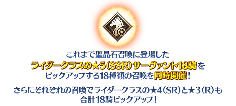 2025年9月9日(火)に予定している「冠位戴冠戦:Rider」の開幕に先駆けて、これまで聖晶石召喚に登場した期間限定サーヴァントを含むライダークラス36騎をピックアップする18種類の召喚を同時開催いたします!