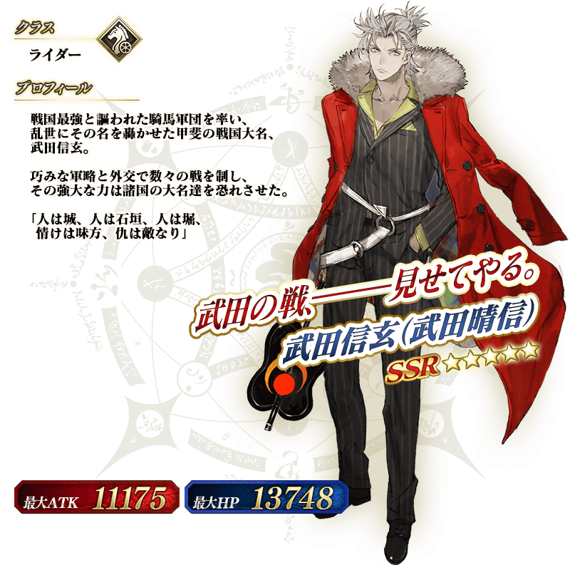 ※「★5(SSR)武田信玄(武田晴信)」は「★5(SSR)武田晴信」を霊基再臨第3段階にすることで名称が「★5(SSR)武田信玄」に変化します。