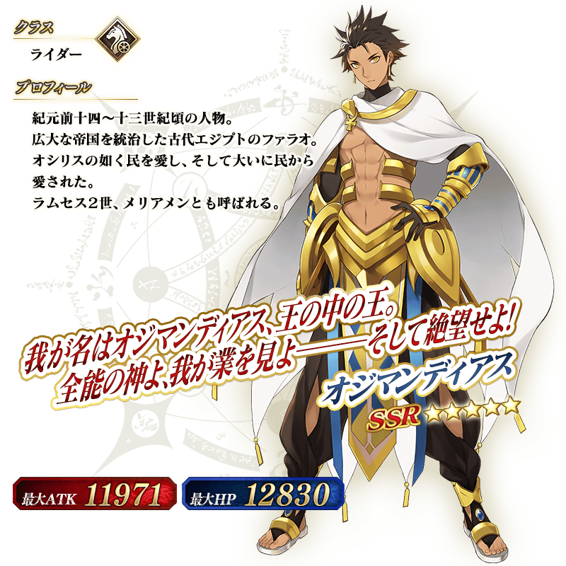 ※上記の「★5(SSR)オジマンディアス」のイラストは霊基再臨第2段階のものです。
