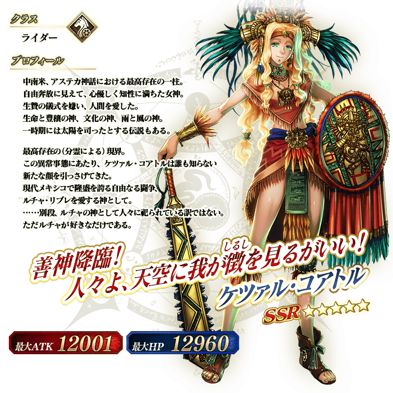 ※上記の「★5(SSR)ケツァル・コアトル」のイラストは霊基再臨第2段階のものです。