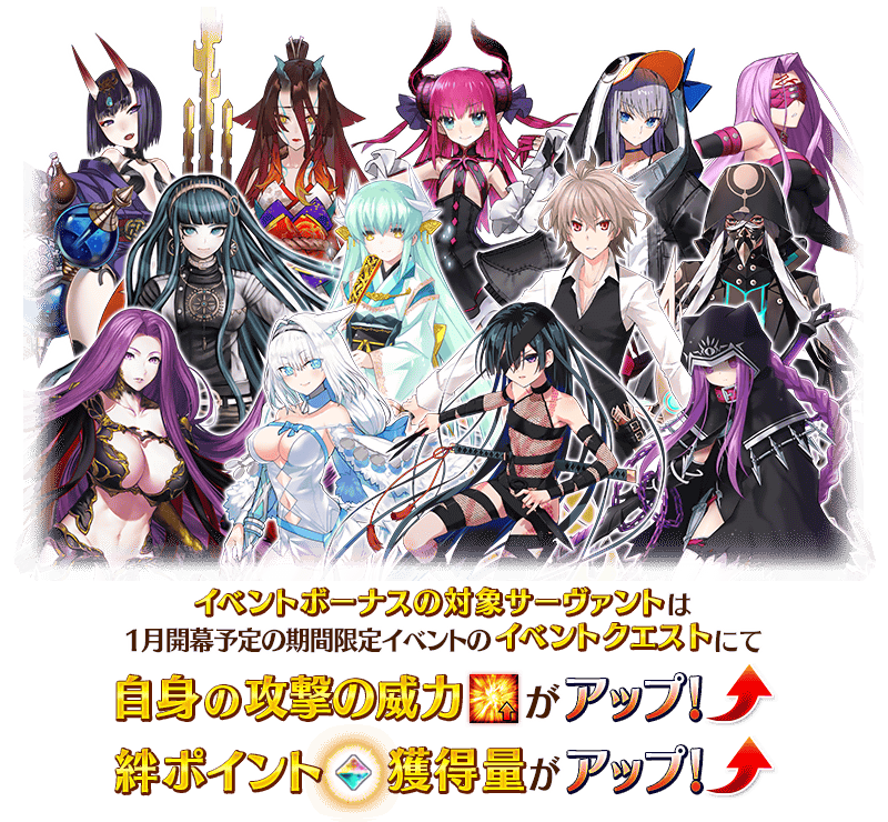 1月開幕予定の期間限定イベントの期間中、一部のサーヴァントはイベントクエストにおける「自身の攻撃の威力がアップ」と「絆ポイント獲得量がアップ」のボーナスを得られます!