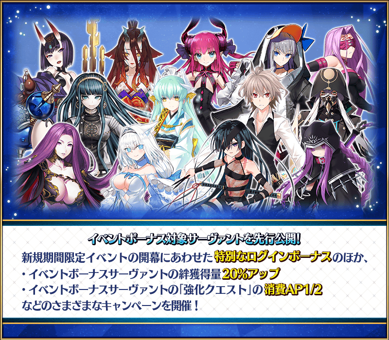 下記の期間中、イベントボーナス対象の一部サーヴァントは期間限定ですべてのクエストで獲得できる絆ポイント獲得量が20%アップします!