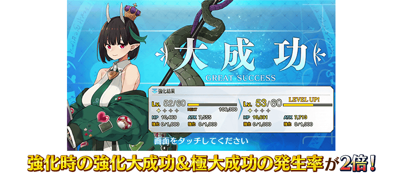 下記の期間中、一部のイベントボーナスサーヴァントの強化をおこなった際に、大成功(経験値2倍ボーナス)・極大成功(経験値3倍ボーナス)の発生率が期間限定で2倍になります!